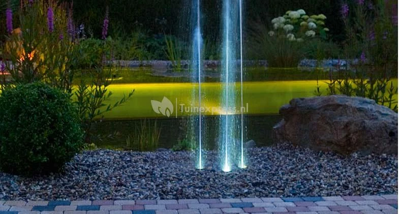 De sproeihoogte van de fontein kan worden ingesteld tussen een afstand van 30 centimeter tot 140 centimeter, u kunt de fontein dus geheel naar eigen wens instellen! De Water Trio fontein is ook een absolute aanwinst voor de zwemvijver. Door de LED-verlichting in de fontein ontstaat er bij schemering een bijzondere sfeer rondom uw (zwem)vijver.